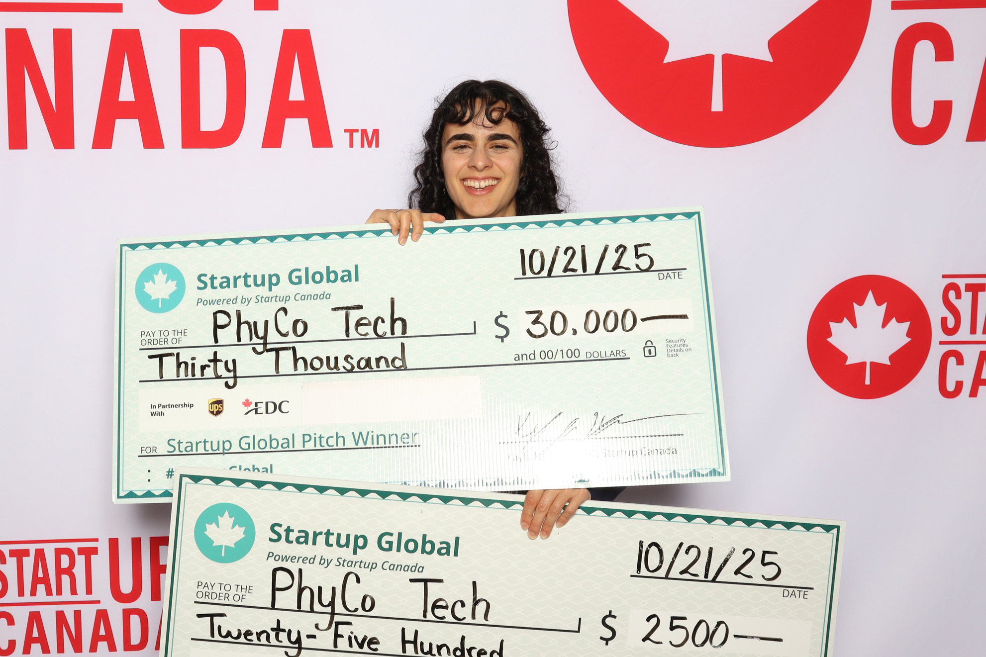 This year, Startup Canada announced the winners of the 2025 Startup Global Pitch Competition Grand Finale at the final Startup Canada Tour stop in Mississauga. Ranah Chavoshi, Co-Founder & CEO of PhyCo Technologies Inc., was named the first-place winner, taking home $30,000. Joeydolls, founded by Samantha Ong, earned the second-place prize of $15,000, while GrownStone, pitched by Adrian Simone, took third place with $7,500. PhyCo Technologies Inc. was also voted the 2025 People’s Choice Award winner, securing an additional $2,500 cash prize.